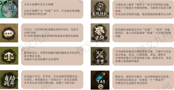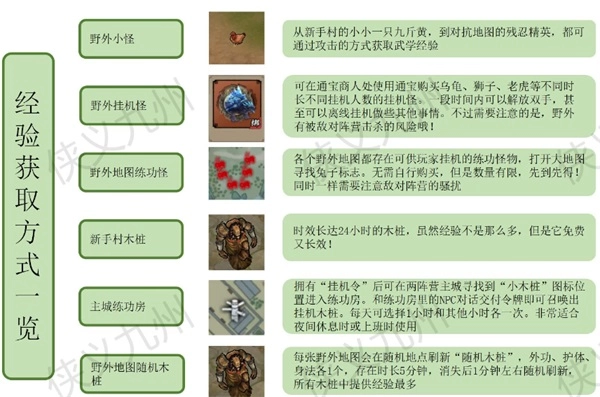 所有木桩分为外功、护体、身法三种类型,可依据外观加以区分。不同区域的木桩在经验值和存在时长上有所不同,并且同一个木桩每次只能由一人使用。