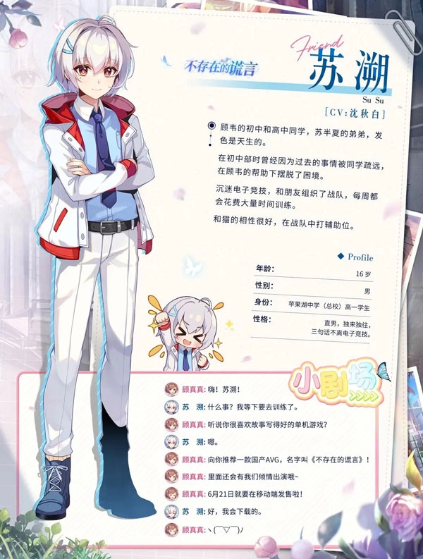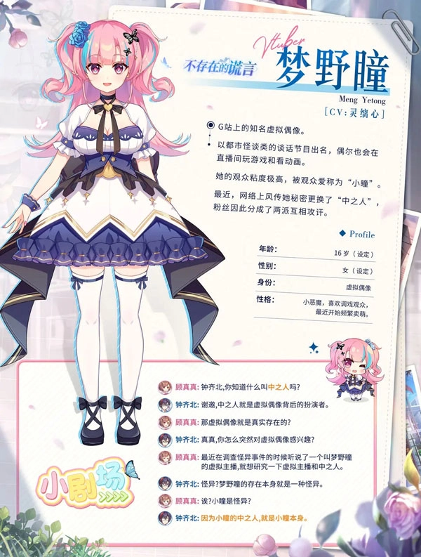 《不存在的谎言》是国内独立游戏团队Never Knows Best打造的怪谈悬疑恋爱AVG作品。故事围绕当下流行亚文化中的虚拟偶像失踪事件展开,在悬疑氛围与恋爱情愫的交织中,勾勒出一段动人的叙事。