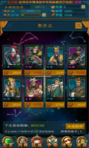 首先看看自己主将的天命情况:刘备和张飞、诸葛亮之间存在天命加成,所以这两位武将是一定要带的,张飞基本和刘备一样属于必出的角色,唯一的问题就是诸葛亮比较难获取。这样一来,队伍里就确定了刘备、张飞、诸葛亮这三位核心人物的位置了。