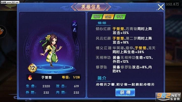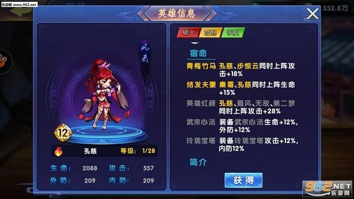 分析:12资质的基础属性较为普通,优势在于进阶培养所需资源减半;天赋整体偏向减伤而非输出,但核心亮点是怒技强力——作为游戏中唯一的奶妈英雄,尽管不少英雄后期进阶后自带吸血效果,不过配备一个能回血的英雄,无论是在副本挑战还是竞技对战中,都能大幅提升队伍的存活率,实用性极高。宿命缘分方面,前期仅需激活“情仪江湖”,且这条缘分与华英雄的某条相同,后续等级提升后很容易解锁;至于天赋进阶的问题则比较简单,很多活动赠送的礼包打开后,都可以选择获取该英雄的相关资源。