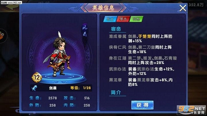 分析:12资质基础属性处于一般水平,但自身输出能力相当突出,前期获取难度低,碎片来源充足;天赋体系整体更侧重输出效果而非减怒机制,且进阶至6阶后能为我方一名队友恢复生命值,综合能力十分优秀。宿命缘分方面,前期仅“英雄红颜”这一缘分的激活条件较苛刻,需集齐三名13资质英雄,这部分需视后续情况而定;天赋进阶带来的优势显著,在狂欢活动的前七天内,只要稍加努力就能获取三个相关资源,完全能满足需求。