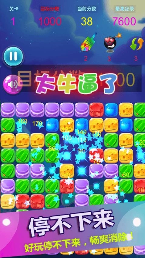 1、关卡推进逐渐解锁全新糖果,任何人都能了解到不同的方块图案与颜色,这会带来不错的视觉体验与冲击。