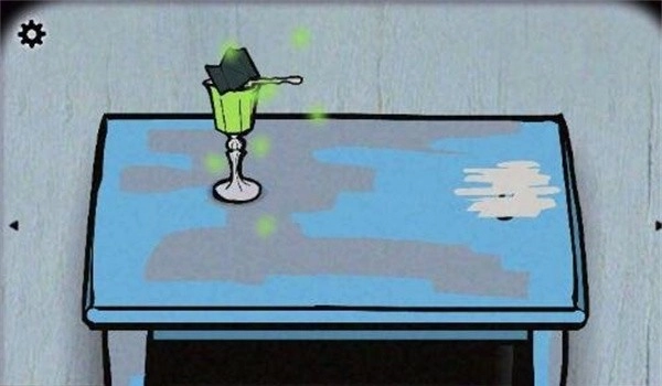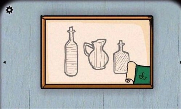 按照画中的提示,把水和酒倒入桌上的容器中[先看第一幅画,弄清楚三种液体各自对应的纹路是什么,再从第二幅画里找到与这些纹路相匹配的容器……这三种纹路就是横、竖、斜纹!]