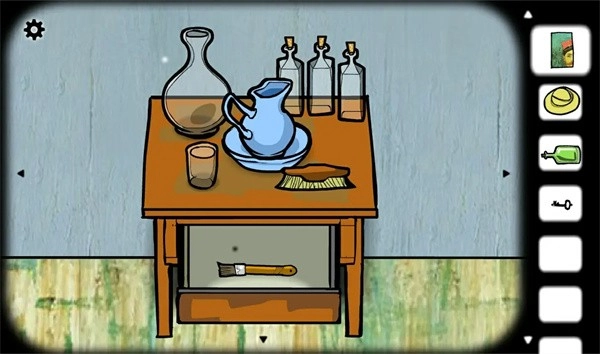 桌子上的水壶、刷子和抽屉里的画刷。