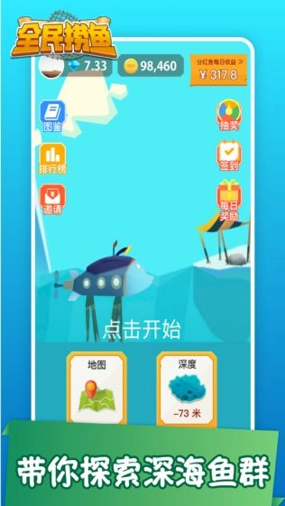 《全民捞鱼》是一款趣味十足的捕鱼游戏,玩家在游戏里将操控潜艇潜入深海捕鱼。游戏内设有图鉴系统,玩家能在其中查看已解锁及捕获过的鱼类,每种鱼类会带来不同的收益。玩家还可通过提升潜艇属性,从而捕捉到体型更大的鱼类。心动不如行动,若你喜欢这款游戏,欢迎前来本站体验!