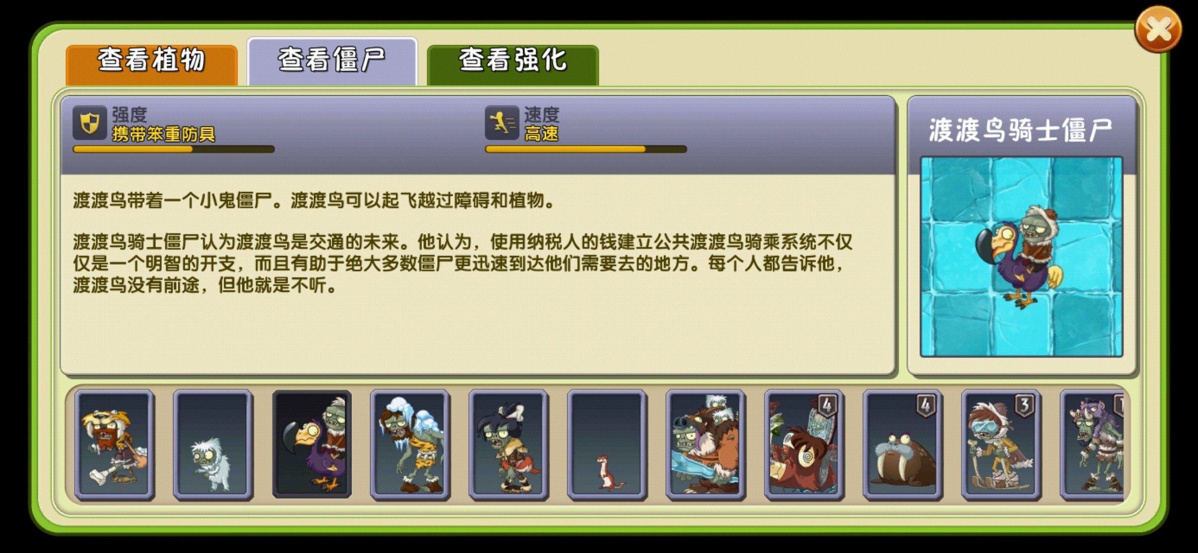渡渡鸟骑士僵尸,这种僵尸每行走一格就有概率腾空飞起,在越过植物的同时向前移动大约1到2格距离。飞行过程中它可能被三叶草吹走,但不会被黄油击杀。