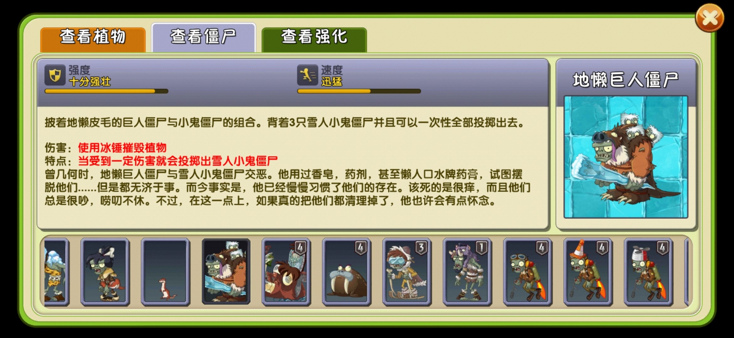 地懒巨人僵尸在生命值分别低于2880、2160和1440(该数值不随阶数改变)时,会向场内第三列投出雪人小鬼僵尸。