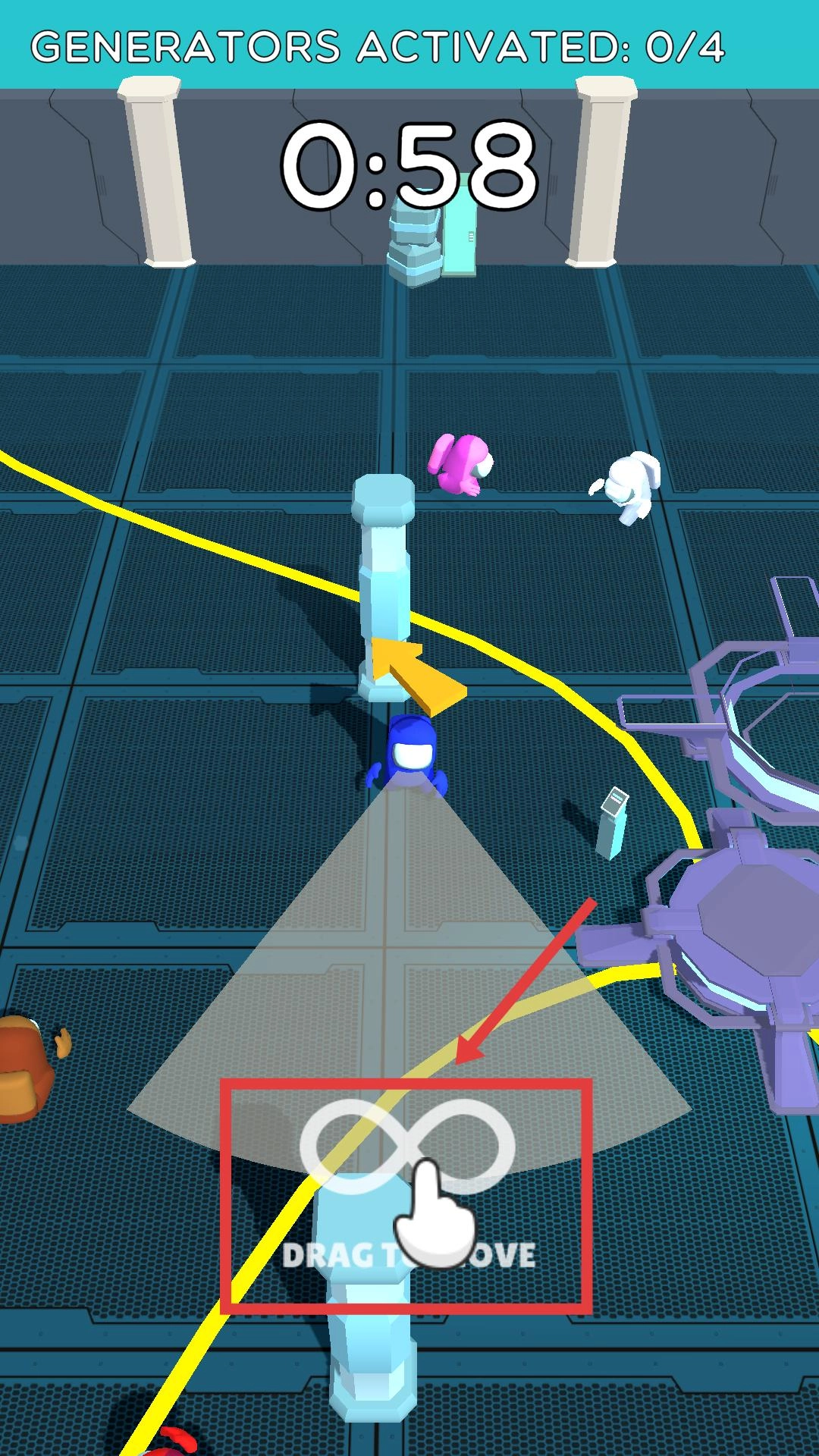 作为幸存者,你需要拖动摇杆来控制移动,在倒计时阶段按照箭头的指引去寻找发电机并将其激活,同时要留意场景中的其他角色。