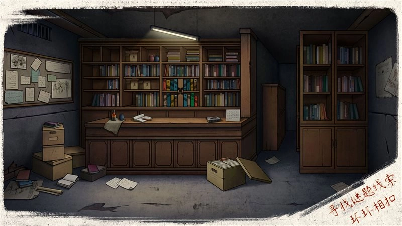 从储藏室出来走到走廊,弯腰捡起地上的「报纸碎片」,再走到走廊尽头的杂物堆里,找到并拿起「钩子」和另一块报纸碎片。之后用钩子勾下左边墙上画上的第三块报纸碎片,接着留意右边墙上画上的提示——看画上面的划痕,按照高度顺序排列就是2134。最后依据这个提示打开抽屉,取出里面的「钥匙」,用这把钥匙打开档案室的门。