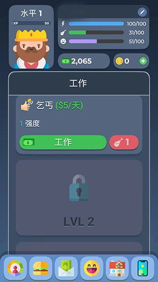 我们需要通过赚钱来让自己过上更好的生活,并且养活自己;只要直接点击屏幕下方“工作”的选项就能获得金钱,但随着金钱数量的增加,体力值、心情值以及饥饿值都会快速下降。