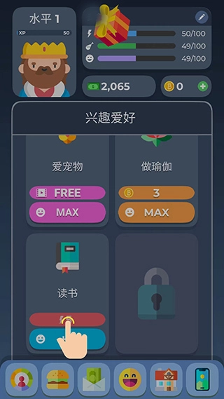 我们可以点击“食品”提升饥饿值、点击“兴趣爱好”提升心情值,不过这些我们熟悉的增益事件都得花费不少钱财,这些支出都会从我们已获得的财富里扣除。