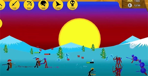 游戏整体画面毫无违和感,不同兵种火柴人的动作设计也十分精细:矿工挖矿、弓箭手拉弓射箭、剑士挥砍,每个动作都流畅自然、行云流水,完全没有生硬拼凑的违和感。