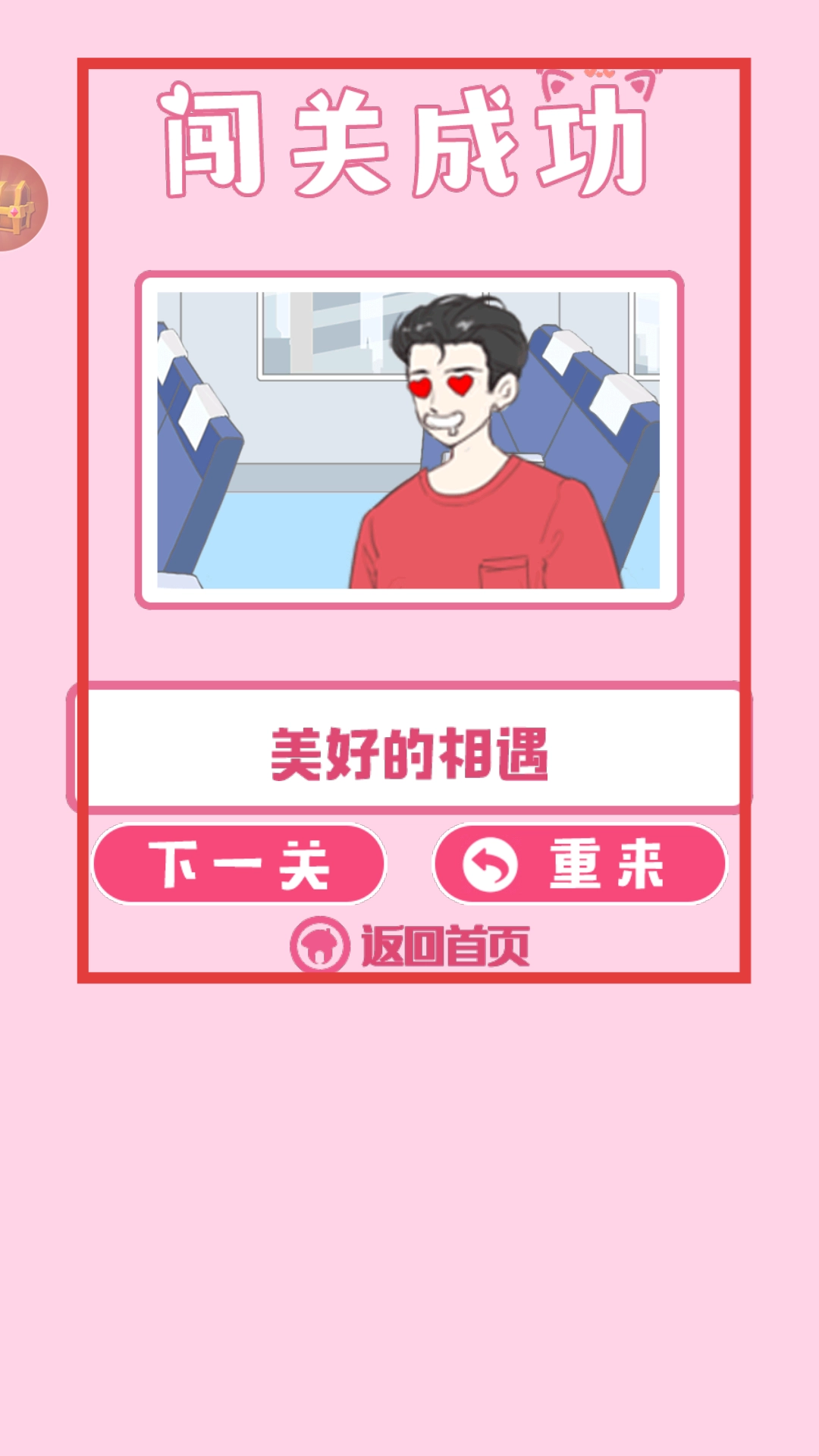 成功完成车厢场景的互动任务后,页面会跳转至闯关成功的界面。该界面采用粉色背景,呈现“美好的相遇”这一标题,同时配有男孩红心表情的图片。点击下一关按钮,即可进入新的关卡场景。