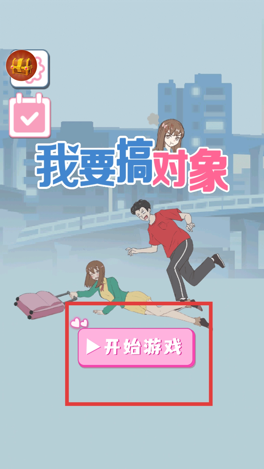 启动“我要搞对象”后进入初始界面,界面展示卡通风格的人物互动场景与“开始游戏”按钮,点击此按钮即可加载并进入游戏关卡场景。