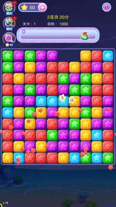 移动不同位置的星星,把相同的组合到一起就能消除,当达到三个或三个以上时会自动消除。