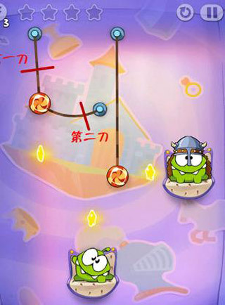 第四关:左边的糖果先切竖直的线,吃到星星后就切断最左边的线。右边的绳子同理。