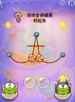 第五关的操作步骤是:首先同时剪断中间的两条线,让糖果吃到泡泡后飞起来,等它到达顶点时,就剪断绳子并同时戳破泡泡。