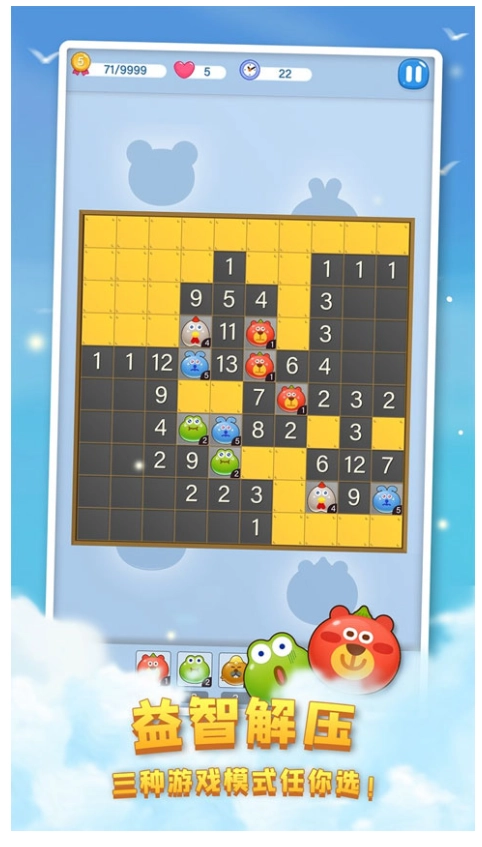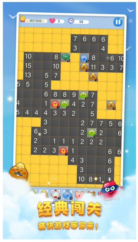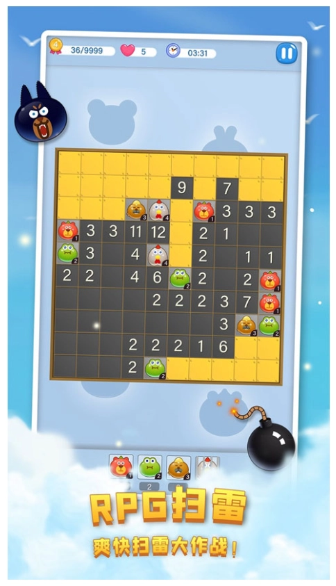 3、玩家只需不断点击棋盘,但同时也需要计算出每一个怪兽所在的位置,攻击同等级或更弱的怪兽,帮助自己提升等级,直至找出所有的怪兽,爽快刺激的扫雷大作战,增强了游戏的可玩性。