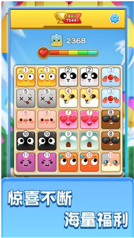 3、每一个表情包头上都会有一个数字,将相同的数字点击就可以进行合并,操作玩法和经典的三消玩法是一样的,玩家可以轻松的合并和组合,从而解锁新的图案,带给您巨大的满足感。