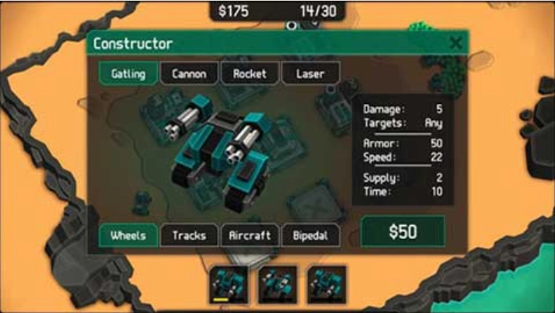 2、玩家可以通过搭配战争兵器的上半部火力武器和下半身移动护甲部分,搭配出合适的武装形态,筑相应的上下半身建筑后,即可在右下角点选相应的兵种建造,多样性的组合,自由闯关。