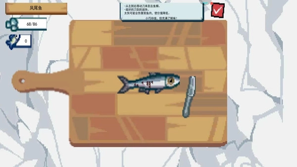 1、通过从左到右滑动屏幕来操控【刮鳞刀】,操作时需保持平稳,避免因速度过快而损伤鱼身,以此获得理想的刮鳞效果,进而提高鱼肉的价值。
