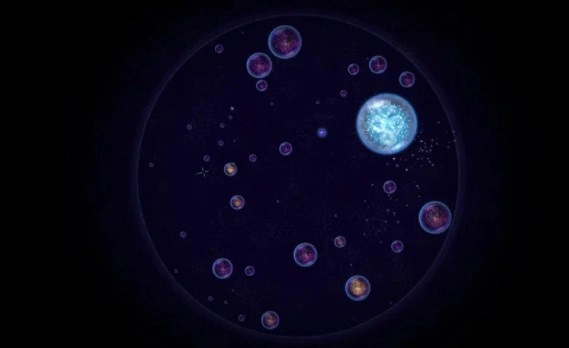 2、在星噬中,玩家是一个球体状的物体,玩家点击星球的一边便会发射出气泡,此时星球会朝玩家点击的反方向移动,点击频率越大星球移动越快星球变小的速度越快,玩家利用星球喷出气泡的惯性进行游戏;