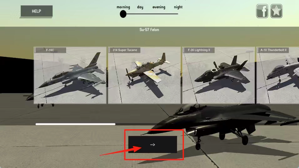 1、点击右下角带有箭头标识的黑色按钮,即可切换查看Su-57、F-35等各类不同的战机型号,从中挑选出适配自身操作风格的机型。