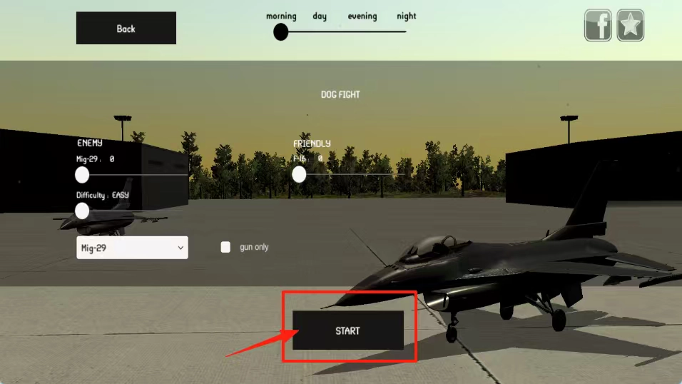 3、点击底部中间的黑色START按钮,开启简单难度的空战游戏,熟悉基础飞行与战斗操作逻辑。