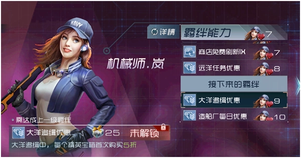 机械师岚里面10个进阶分别是:商店免费刷新I、每日登陆奖励翻倍、商店免费刷新II、实兵对抗优惠、商店免费刷新III、精英战役重置优惠、商店免费刷新IX、远洋任务优惠、大洋追缉优惠、造船厂每日优惠。