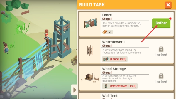 4、点击【Fence】对应的【Gather】,收集材料建造围栏增强防御。