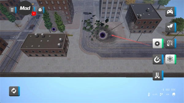 1、选择右侧的灾害工具如龙卷风、核爆等,对城市区域如公园、街道释放灾害。