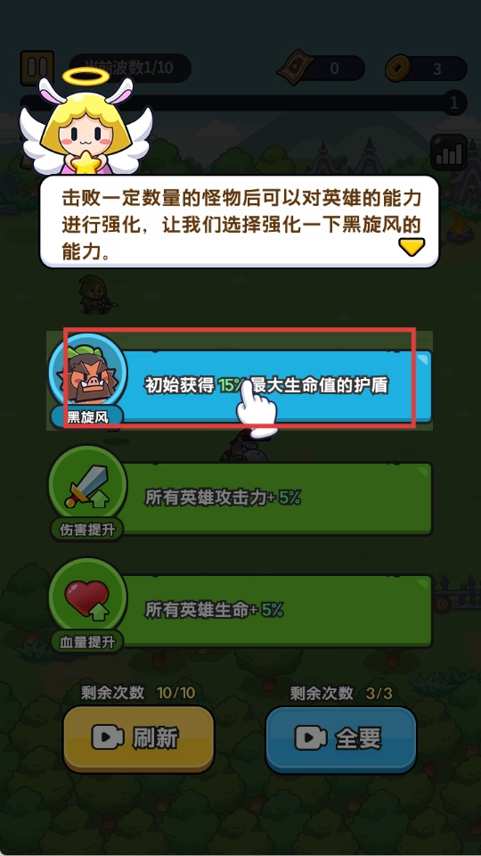 4、击败一定数量怪物后,选择强化英雄能力,提升队伍战力。