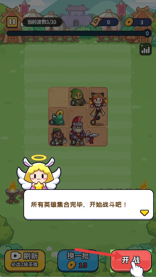 2、英雄集合完毕后,点击【开战】,开启战斗,挑战当前波数的敌人。