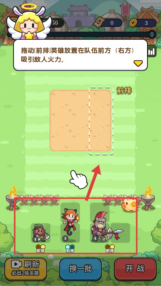 1、拖动前排英雄放置在队伍前方,吸引敌人火力,搭建战斗阵容。