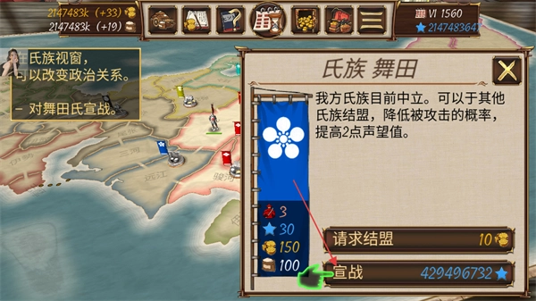 3、在氏族视窗中,可对其他氏族宣战,如对舞田氏宣战,发起军事冲突。