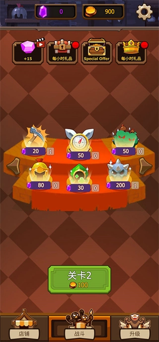 1、花费金币解锁Level2进入新关卡,可在商店升级镐头、时钟等道具增强战力。