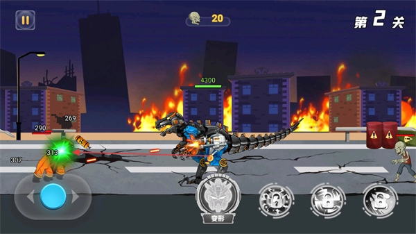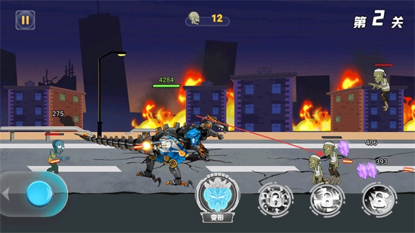 2、通过左侧摇杆控制机甲移动,在第2关的城市废墟中与僵尸战斗,发起攻击。