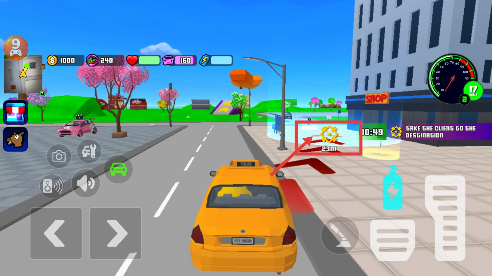 1、驾驶过程中通过左右方向键控制车辆方向,点击加速按钮来提高车速,完成【TAKETHECLIENTGOTHEDESTINATION】这一任务,同时注意关注界面上显示的资源数值。
