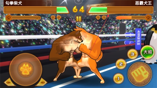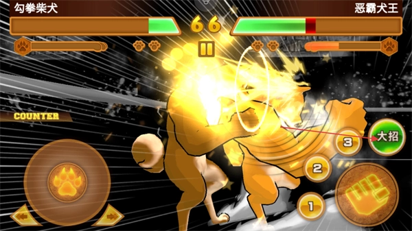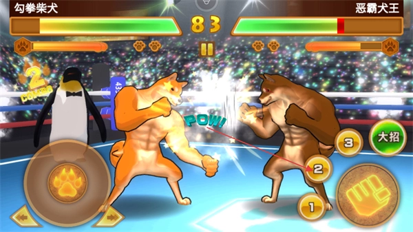 1、操控勾拳柴犬与恶霸犬大王对战,点击右侧数字按钮1、2、3出拳,攻击对手手臂等部位。