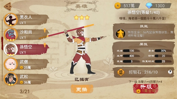 5、我们找到孙悟空对其进行升级操作。