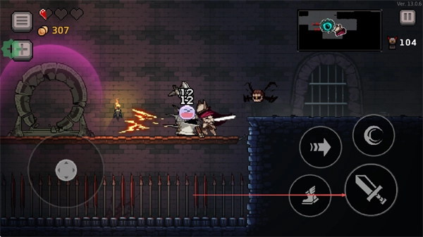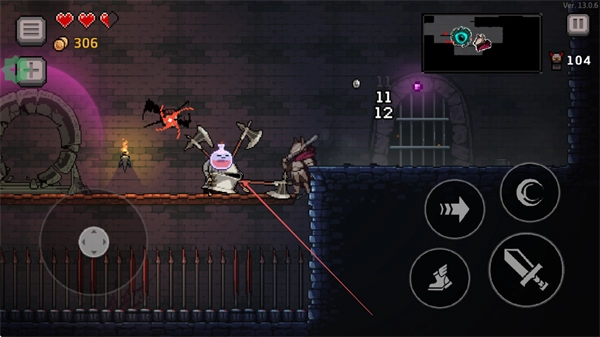 1、通过左侧虚拟摇杆控制角色移动,右侧按键分别对应冲刺、技能和攻击,灵活操作在城堡场景中探索。
