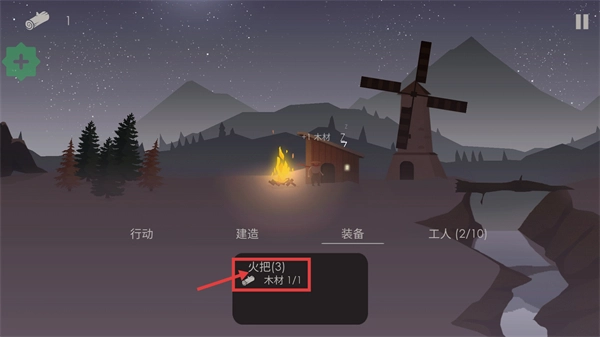 1、在装备界面注意【火把(2)-木材0/1】的资源需求,通过行动收集木材,保证工人在农场实现自给自足以维持生存。