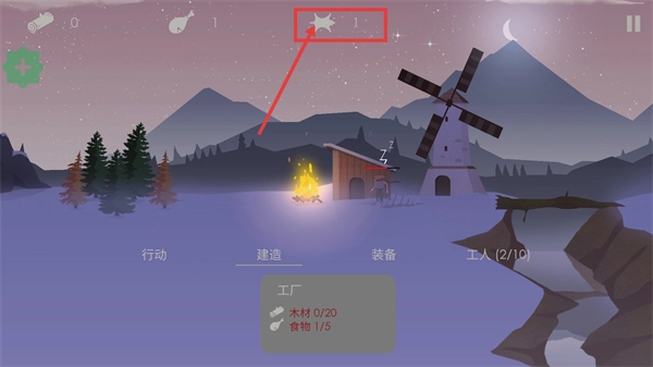 4、战斗后积累【1】的资源,推动【工厂-木材0/20-食物1/5】的建造进程,逐步完善生存设施。
