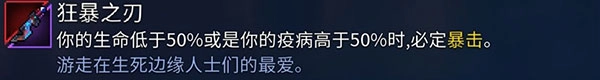 原因:手感相当出色,搭配变异开放性伤口的效果,能够实现100%的暴击率;属性条还能洗出对流血效果提升百分比伤害的词条,整体表现堪称完美。若硬要找出不足,那便是和刺客匕首一样存在攻击距离偏短的问题。
