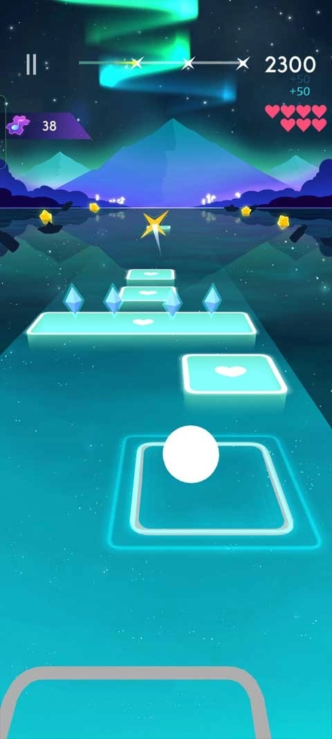 2、玩家在跳跃的过程中还会遇到长方形的方块,这个是用来改变球体的颜色的,除了要避免球体掉落之外,玩家还需要收集蓝水晶和黄水晶,黄水晶就像消消乐里面的星星一样的作用,而蓝水晶可以解锁歌曲、主题等。