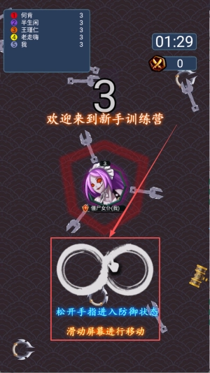 2、移动角色:松开手指进入防御状态,滑动屏幕进行移动。