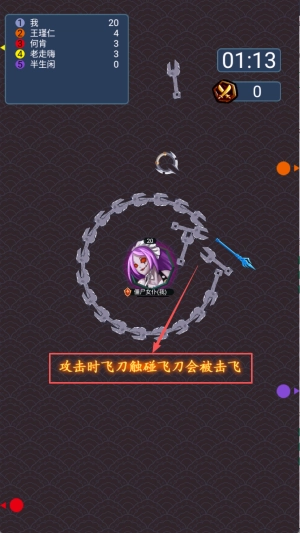 3、攻击敌人:攻击时飞刀触碰飞刀会被击飞,飞刀击中英雄可以击杀对手。