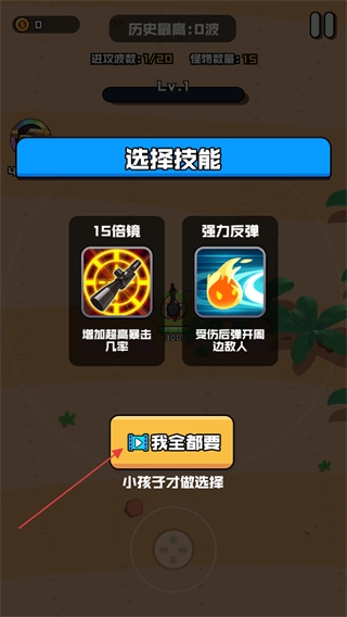 1、在技能选择界面点击我全都要,同时获取15倍镜,强力反弹技能,增强战斗能力。