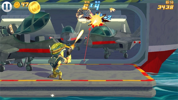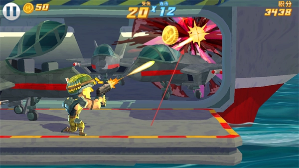 1、在航母场景中射击敌人,触发双倍连击效果,积累金币和积分。