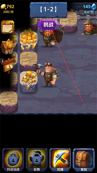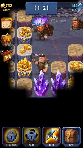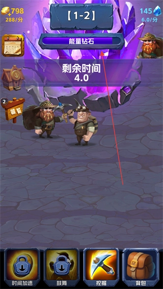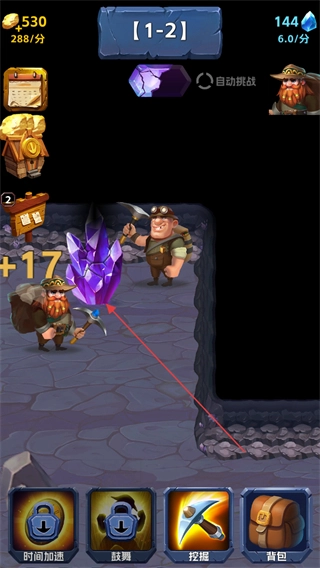 1、在1-2关卡中,点击紫色水晶,矿工开采获得+17资源,积累金币与钻石。